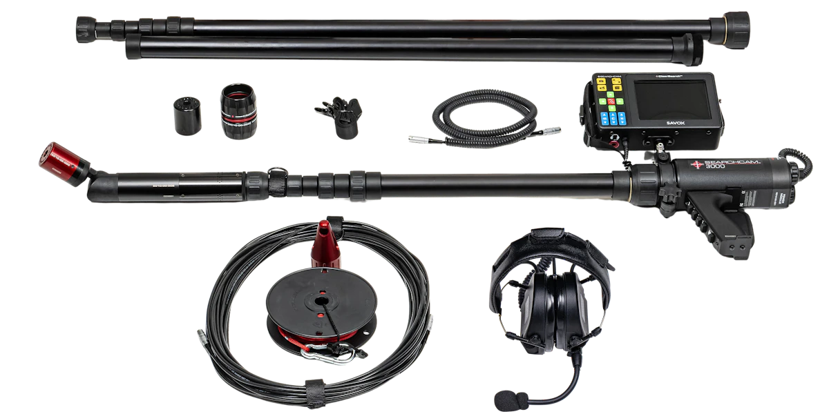The SearchCam 3000 Kit 2, designed to locate trapped victims, features an articulating waterproof camera head with high-output LED illumination. This enables pinpointing the victim’s location for prompt and safe extraction. The kit includes both color and infrared camera heads, along with a long telescopic tube, an extension tube and the required long cable.